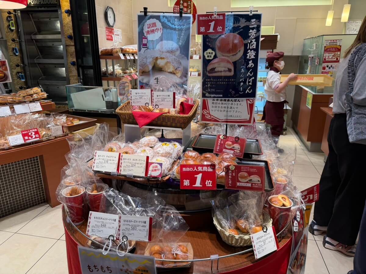 横浜に本社を置くベーカリーチェーン「ポンパドール」の三芳店で限定販売されている商品で、店頭の「当店の人気商品 第1位」のポップも目を引きます。