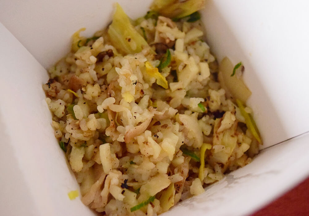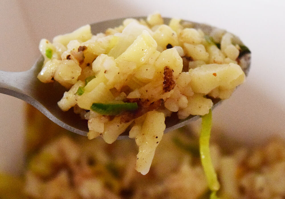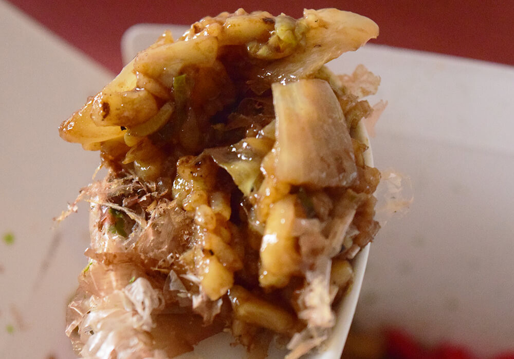 ごはんは小粒で、かつおぶしや豚肉、キャベツとしっかり混ざり合っています。さらに、短くカットされたもっちり食感のうどんが絡み、独特の一体感があります。味付けはソースが強めで、全体としてはお好み焼きやたこ焼きを思わせる仕上がり。やや濃いめの味付けです。分量は可もなく不可もなくといった印象でした。
