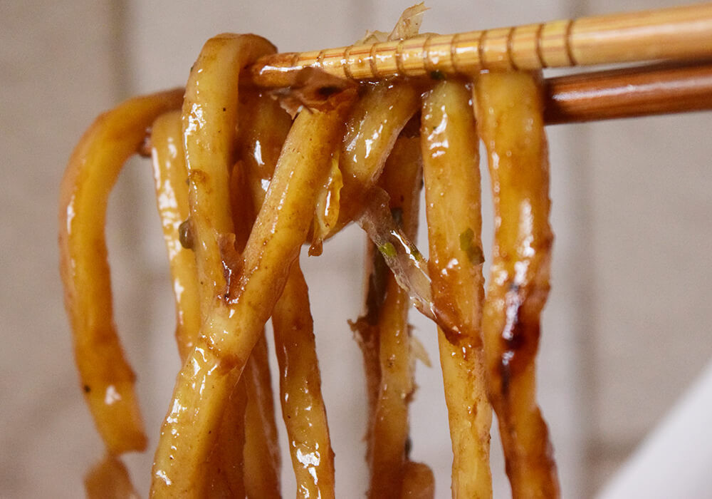 もちもちのうどんに、ごはんが一体となった一品です。特製ソースに、スパイスを効かせ、じゅわっと香ばしく焼き上げた一皿は、コク深く濃厚な味わいとのこと。お祭りの屋台で食べるような焼きそばみたいな味わいなのでしょうか。