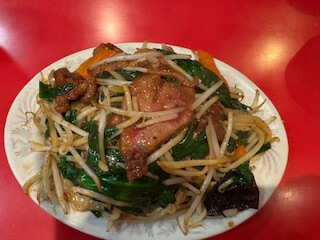 大皿に山盛りのキャベツやピーマン、豚肉がたっぷり入っていました。鉄鍋で一気に炒めた香ばしい香りが食欲を刺激します。