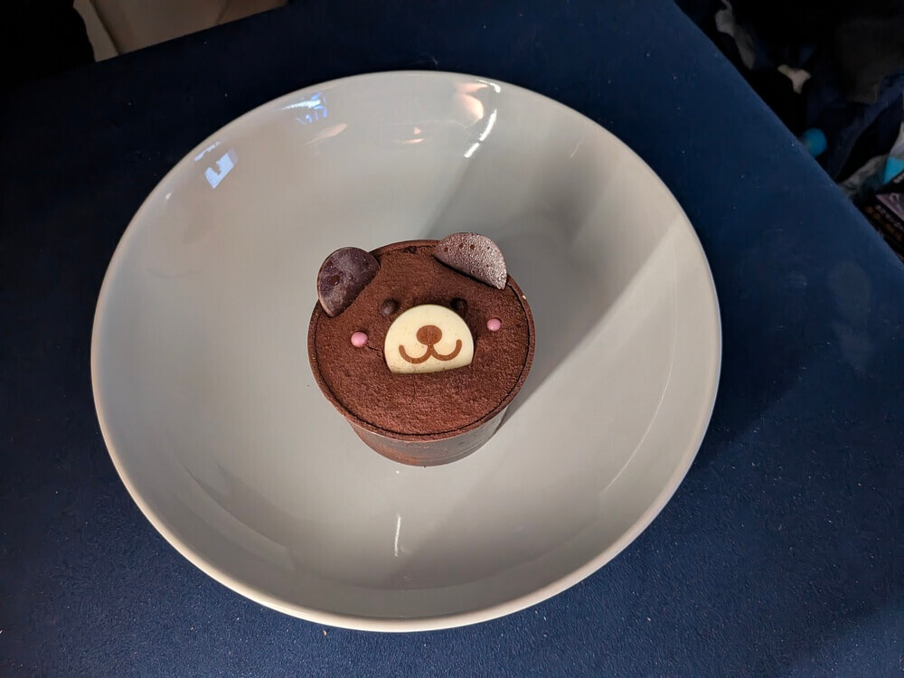 ふっくらとしたチョコレートスポンジケーキをベースに、熊の顔をかたどった可愛らしいスイーツになっています。
