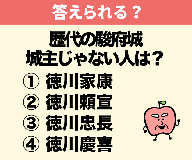 では、次の歴史上の人物のうち、歴代の駿府城の「城主」になったことがない人物は誰でしょう?