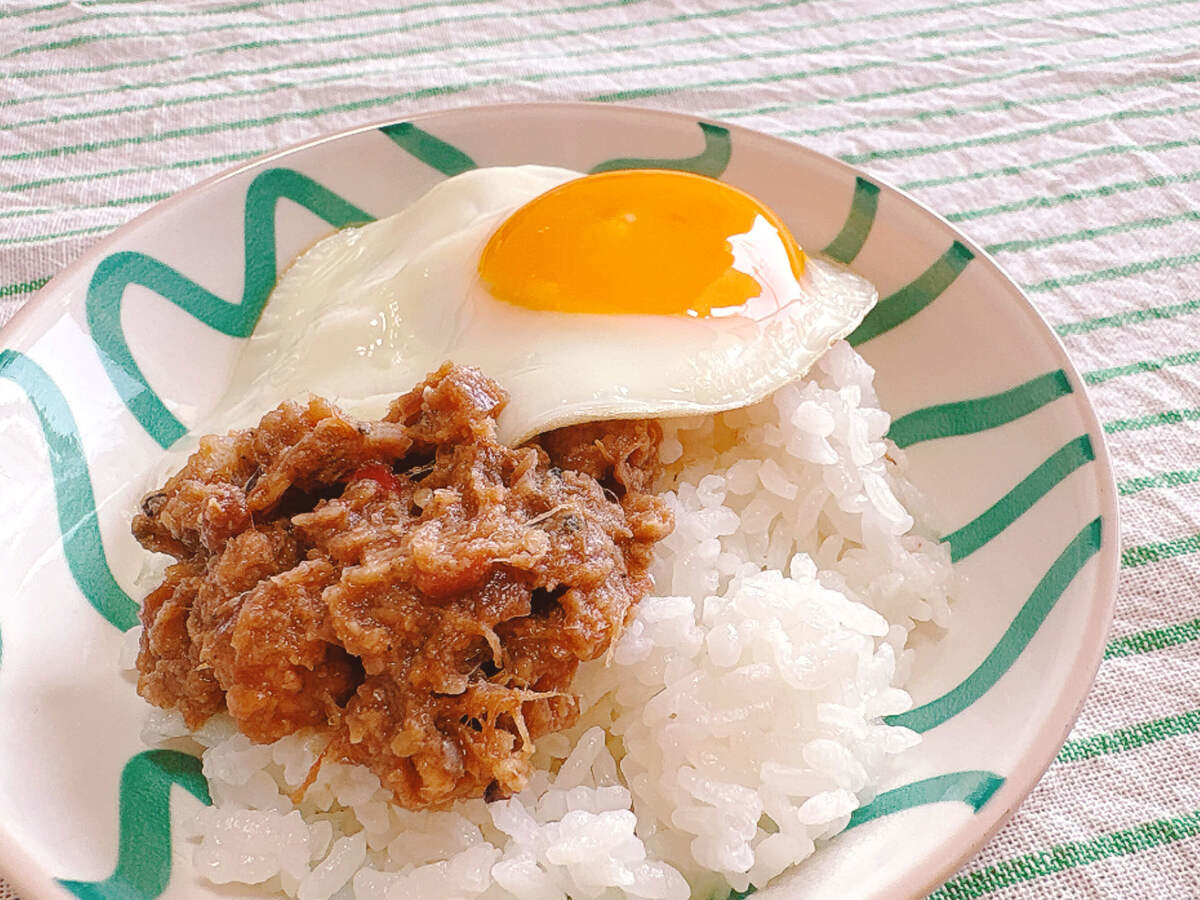 ガパオライスはごはんにブタイチバン、目玉焼きを乗せれば完成で、パクチーやライムを加えるとぐっと本格的になります。