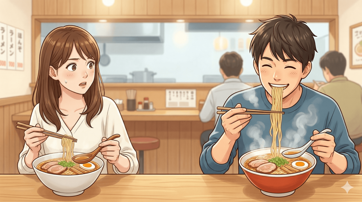 ラーメン屋で「旨いね!」と麺をすする彼氏にゾッ…!【この食べ方、マナー違反では??】"ラーメン屋さん"がピシャリ回答!