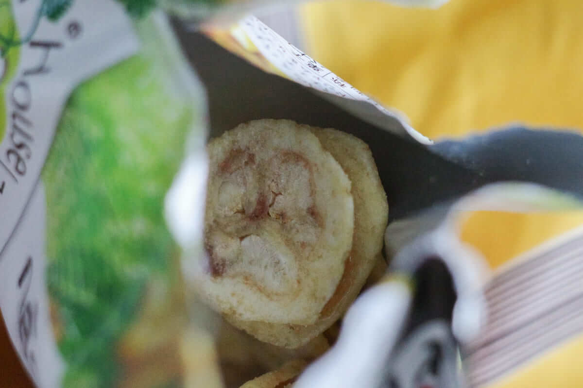封を開けた瞬間に、香ばしいココナッツオイルと揚げたバナナの自然な香りがふわっと広がります。