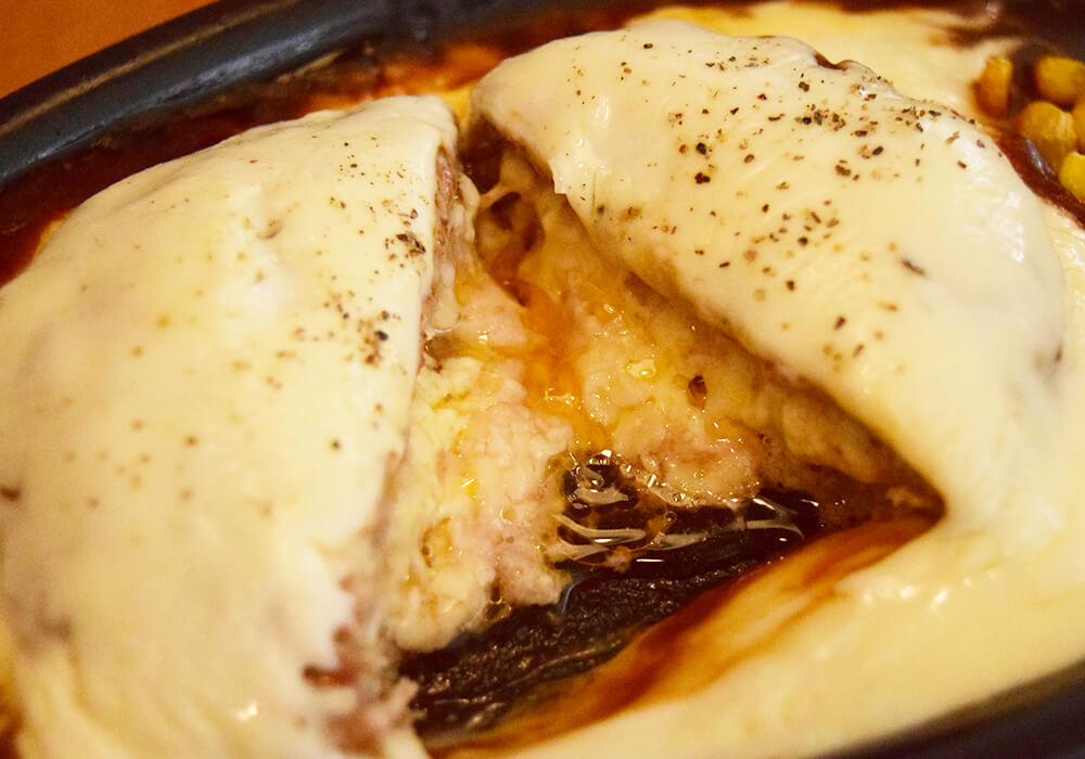 一方、グランドメニュー「チーズONチーズINハンバーグ」も989円(税込)ですが、ライスやスープは付きません。