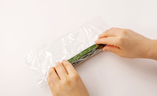 ラップできゅうり全体を覆い、ぴったりと包みます。