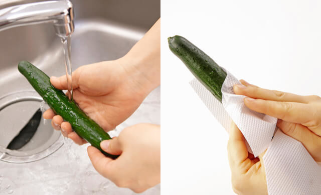 冷水できゅうりを洗った後、キッチンペーパーでしっかり水気を拭き取ります。