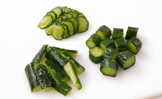 薄切りは塩もみしたようなしなしな状態に。ぶつ切りやスティック切りは、みずみずしいシャクシャクとした食感が楽しめますよ。