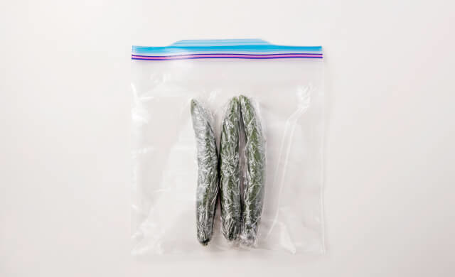 ラップに包んだきゅうりを冷凍用保存袋に入れて口を閉じ、冷凍庫で保存します。