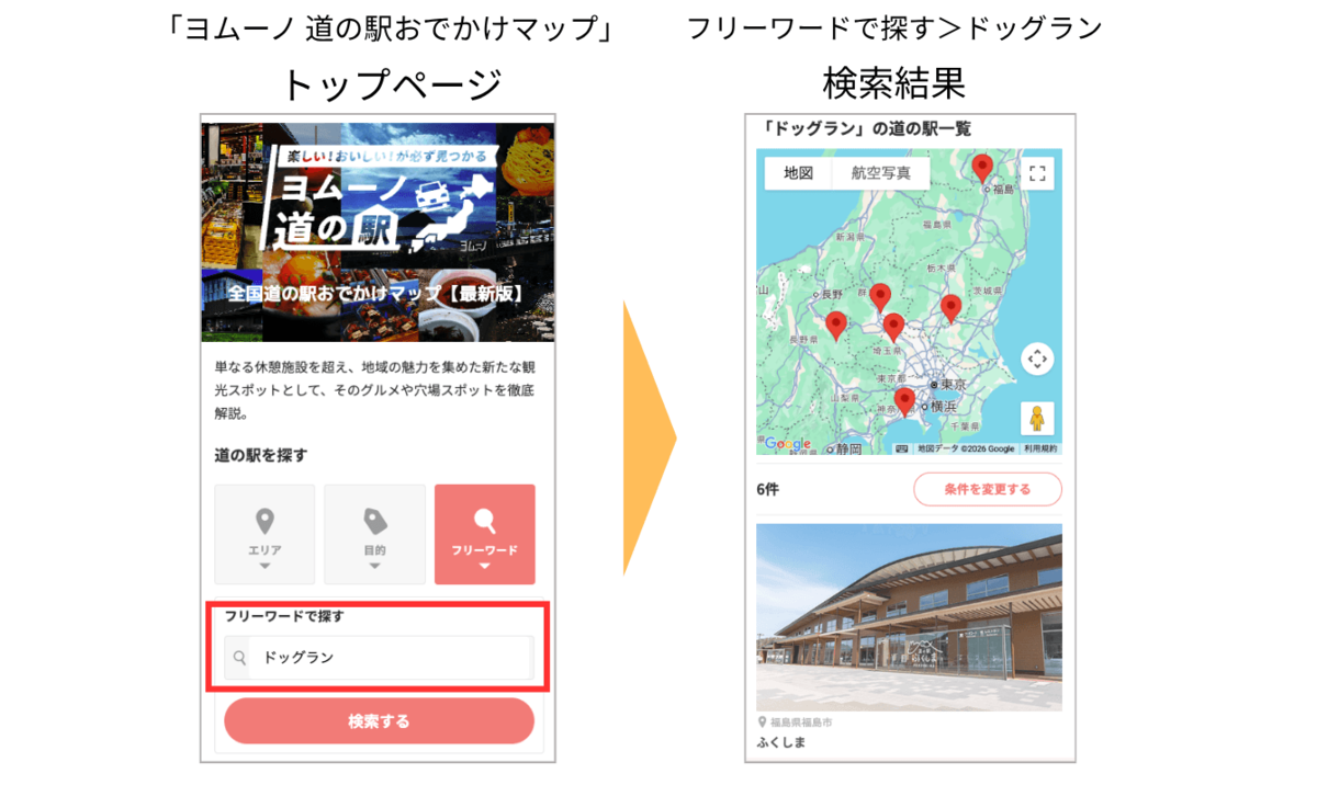 「ドッグラン」「いちご狩り」「ソフトクリーム」など、特定の目的やグルメでピンポイントに探したいときに便利です。気になる道の駅の名前を直接入力して検索することもできます。