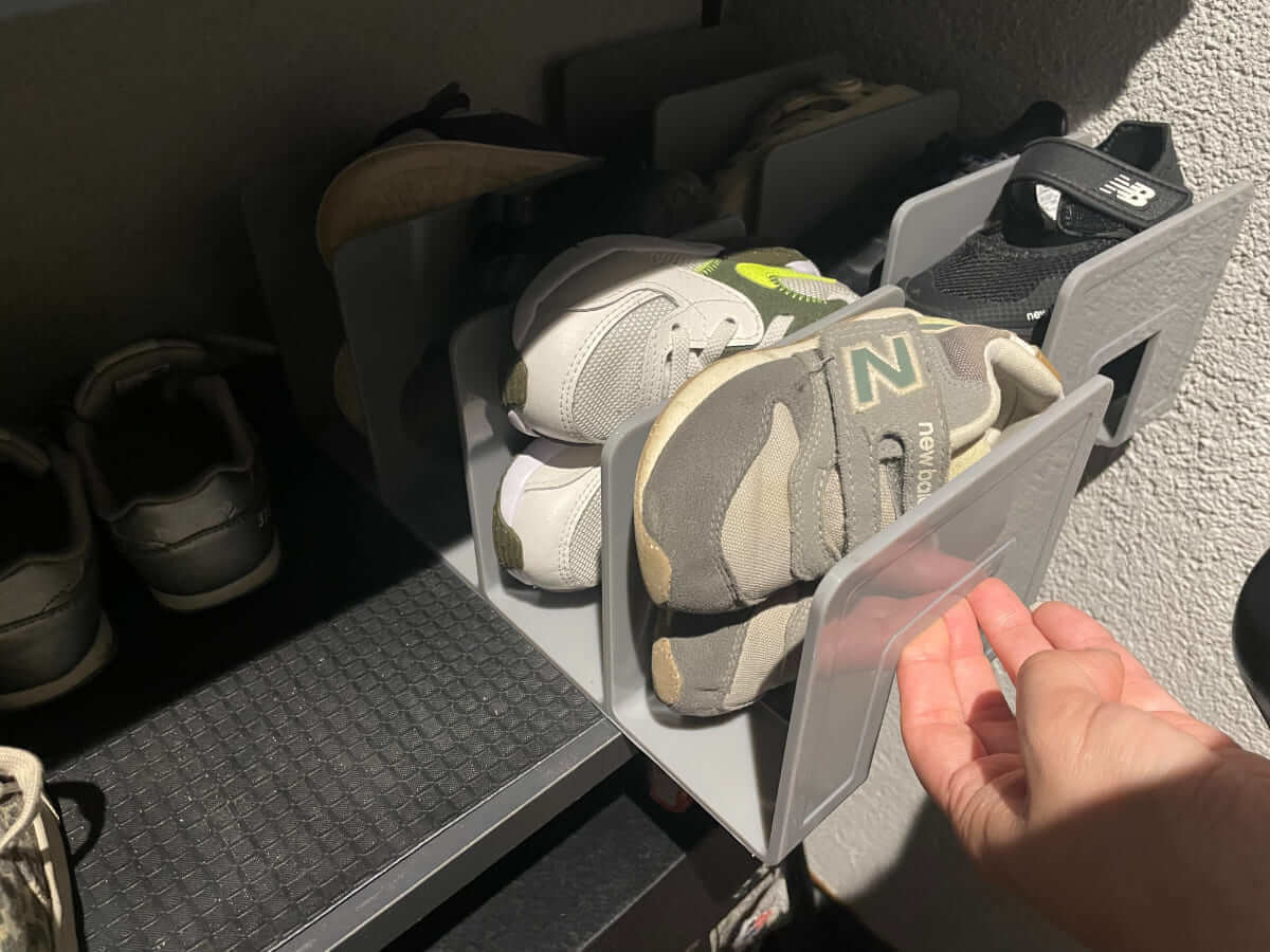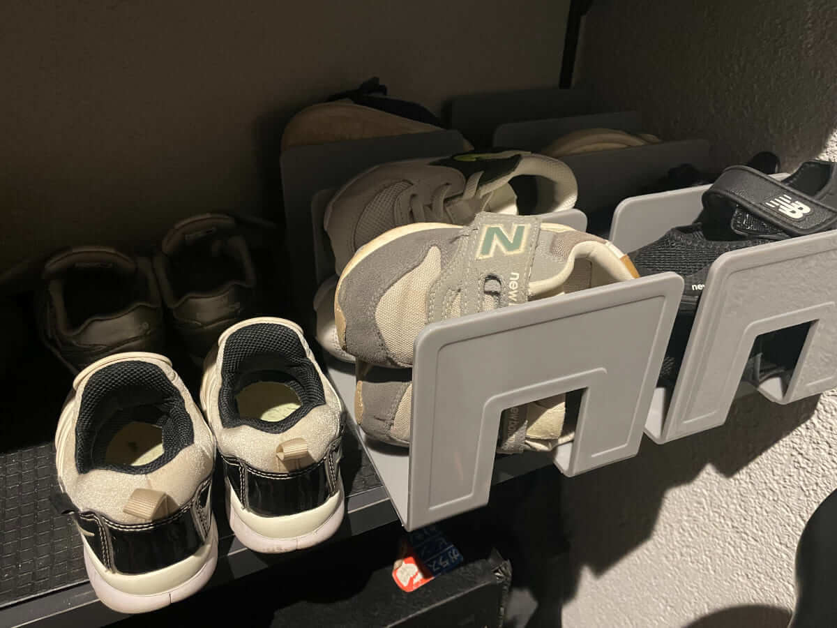 本来は、本や書類が倒れないように支えるための収納用品ですが子どもの靴がピッタリ収まります。我が家の子どもの靴のサイズは13cmと16cmなので、20cmぐらいまでは並べられそうなサイズ感です。