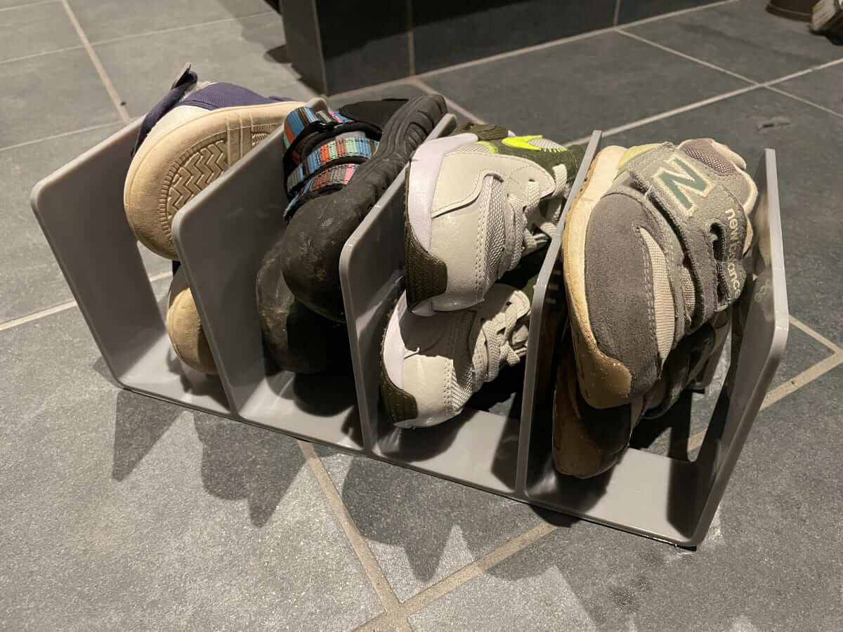 奥にある靴も簡単に取り出せて、収納力も並べて置いてる時より増えます。