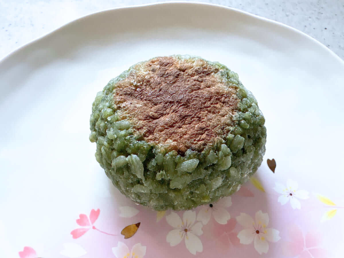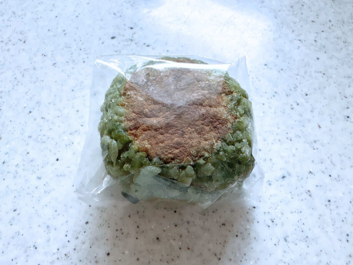 「粗搗き大福よもぎ」は、一般的な大福とは一線を画す、お米のしっかりとした粒感を残した仕上がりが魅力。
