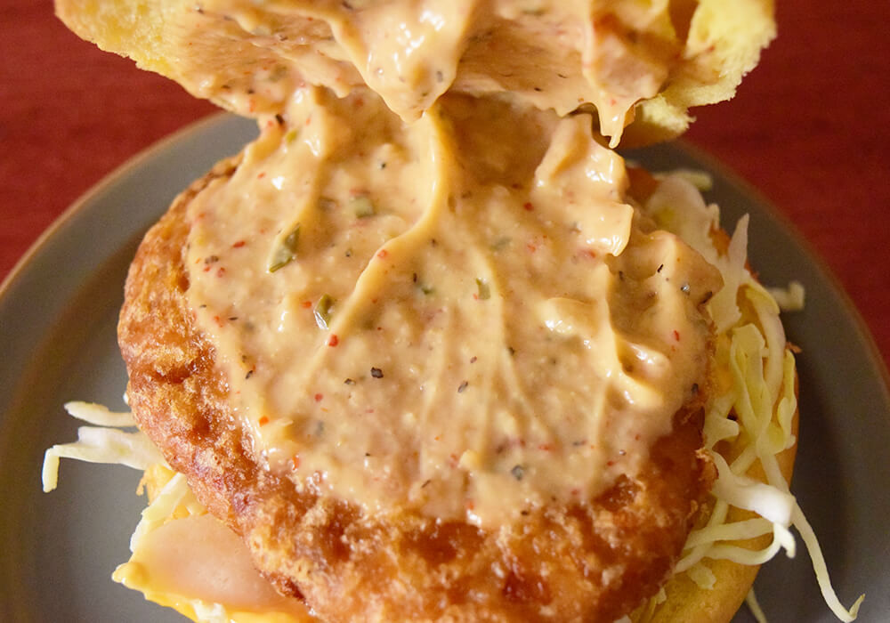 チキンタツタパティに、ごま油をベースにネギ・にんにくの香味油をブレンドした、生姜がアクセントの油淋鶏風タルタルフィリングがかかっています。見た目にもたっぷりとかかっており、しっかりとしたパンチのある味わいが期待できそうです。