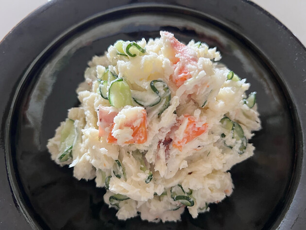 蒸したにんじん、絞ったきゅうりとたまねぎを混ぜたら完成です。見た目はいわゆるお惣菜売り場で売っている、”ザ・ポテトサラダ”といった風情。
