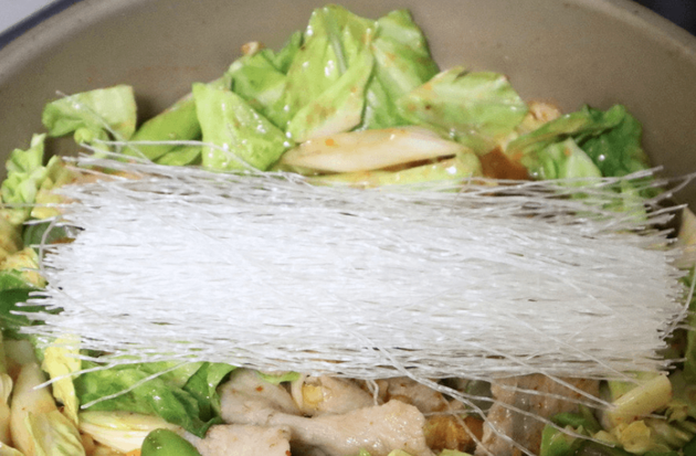豚バラ肉とたっぷりの野菜やキムチを炒めて、最後に春雨を加える簡単レシピ!