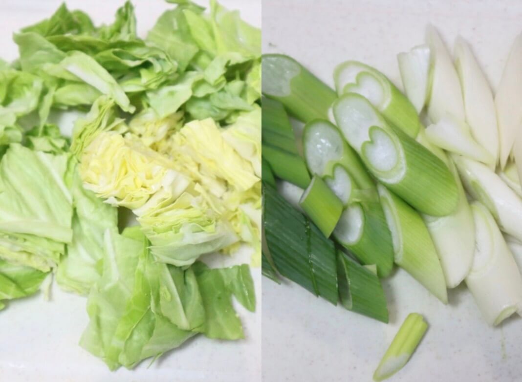 キャベツはざく切り、長ねぎは1cm幅の斜め切りにします。