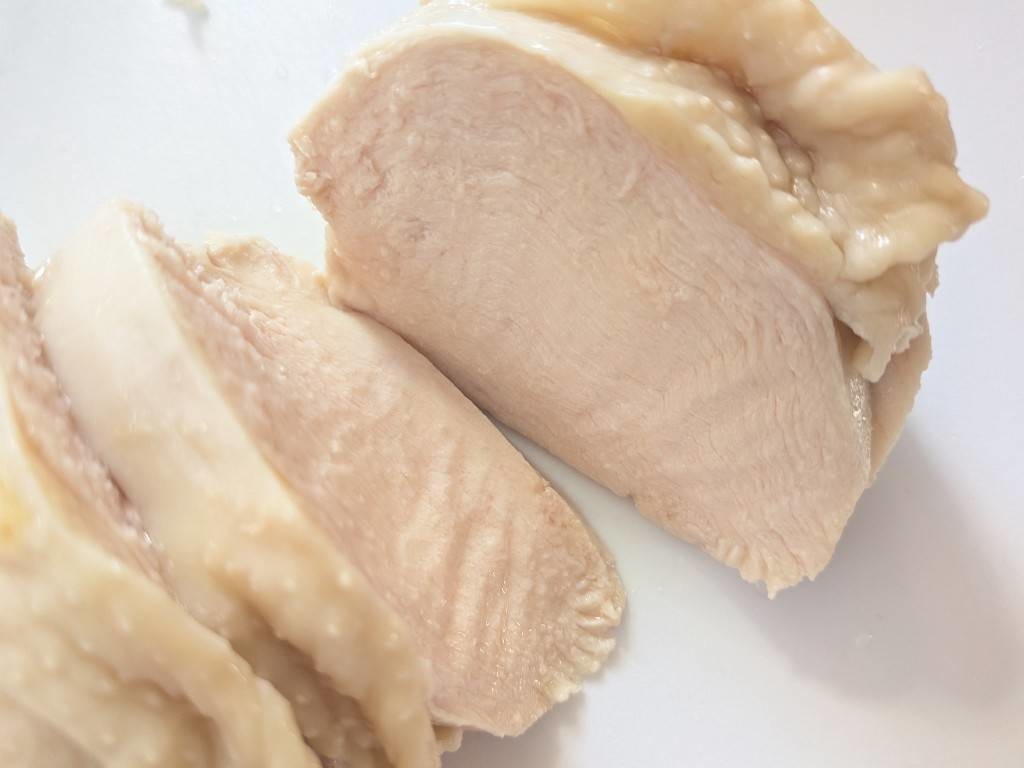 水にドボンして、沸騰までに数分、その後は放置していただけなのに、しっとり感がすごい茹で鶏が完成してしまいます。