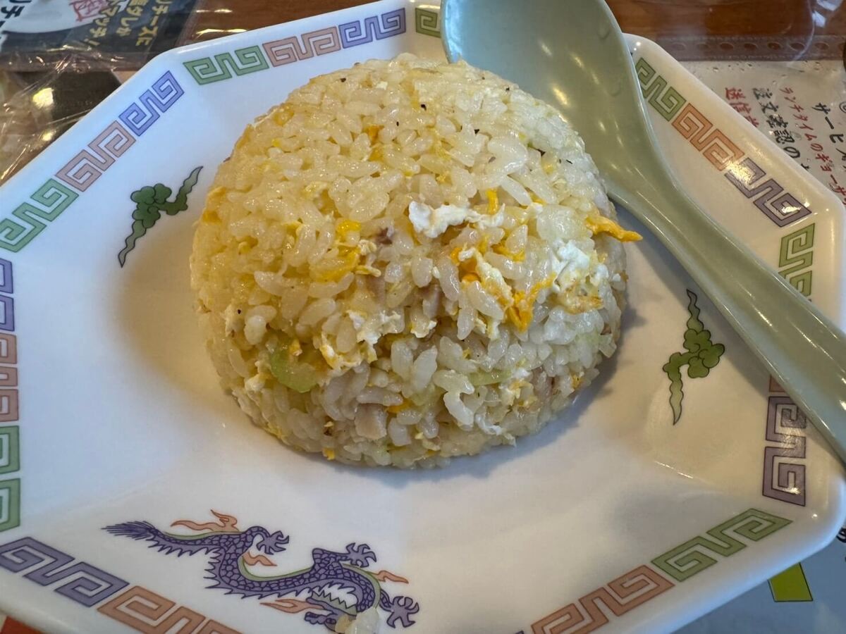 半チャーハンは、卵とネギを使った王道の仕上がり。黒こしょうがほどよく効いていて、香ばしさとシンプルなおいしさが引き立っています。