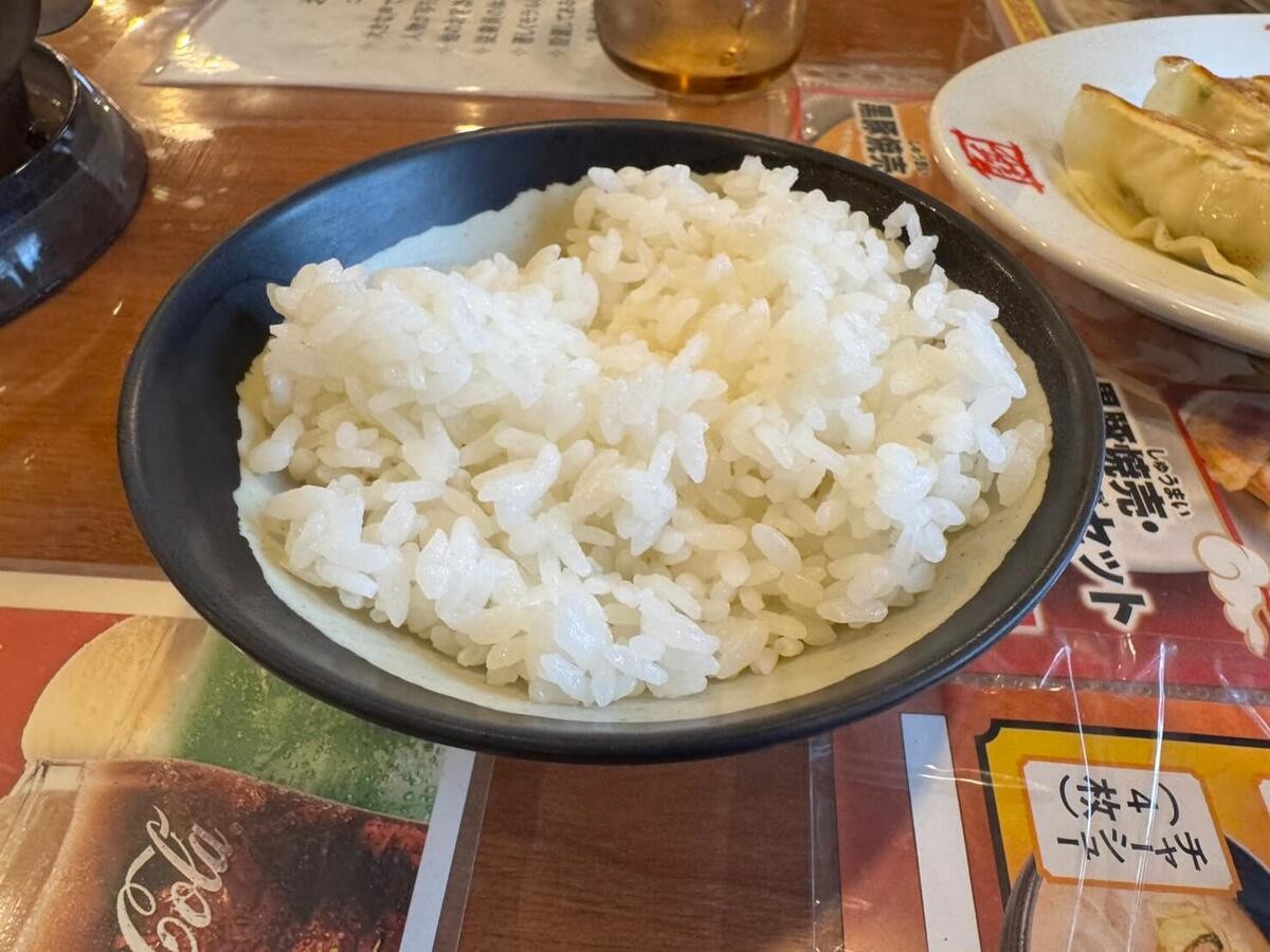 ライスは、ややかために炊かれていて、しっかりした食感が特徴です。ギョーザをおかずに食べるのはもちろん、味噌ラーメンのスープを少し含ませて食べるのも相性抜群。
