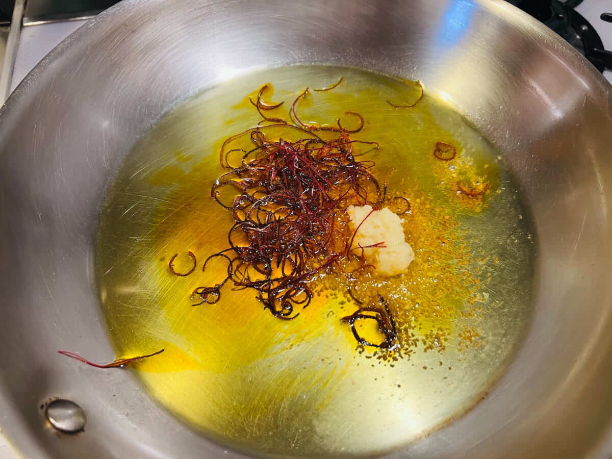 さばを魚焼き器で焼いている間に、オリーブオイルと刻みニンニク、唐辛子を低温で炒めます。