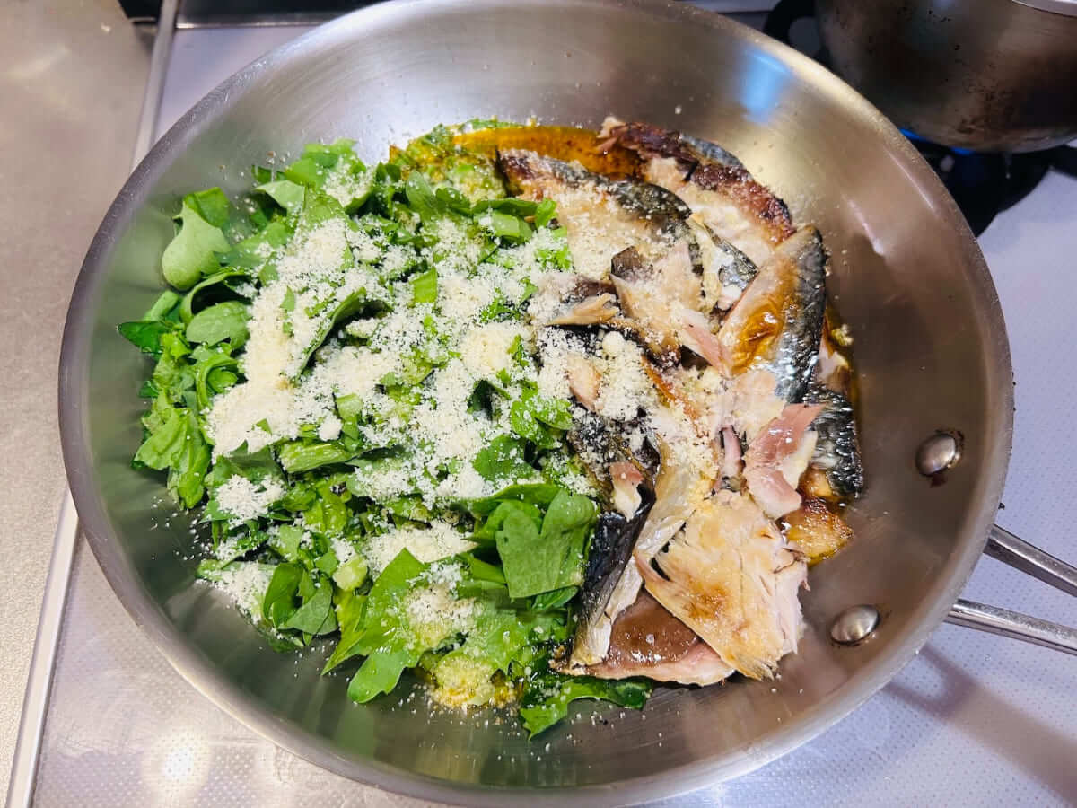 焼けたさばと春菊を投入。骨とり済み商品なのでドンと放り込めば自然にほぐれます。