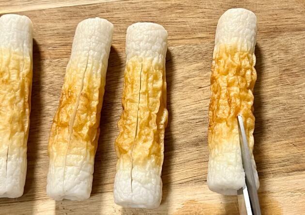 ちくわは開くように縦に切り込みを入れます。包丁よりもキッチンバサミを使って切るのが簡単で安全なのでおすすめです♪