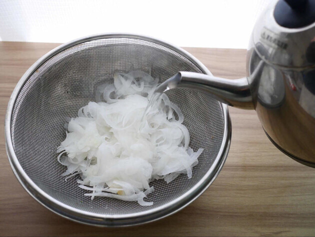 時間を短縮したいときは、薄くスライスした新玉ねぎをザルに入れて熱湯を回しかけ、すぐに水で冷しましょう。