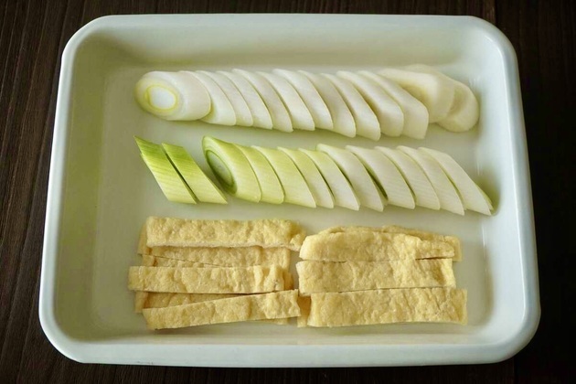 油揚げは短冊形に切り、ねぎは斜め切りにします。