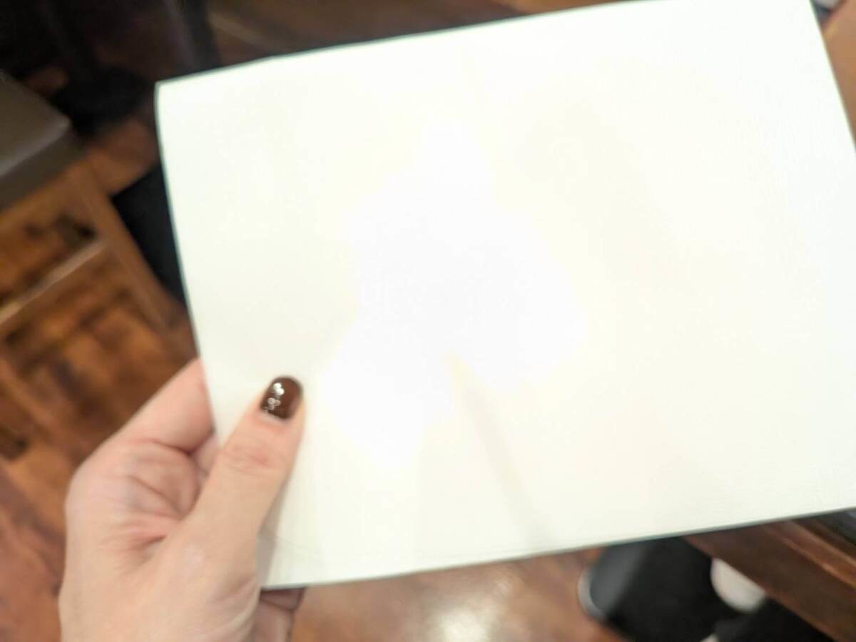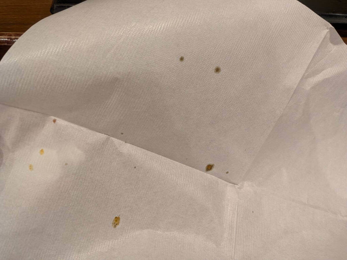 めちゃくちゃ気を付けて食べていたけど、紙エプロンはやっぱりこんな感じに……(笑)。