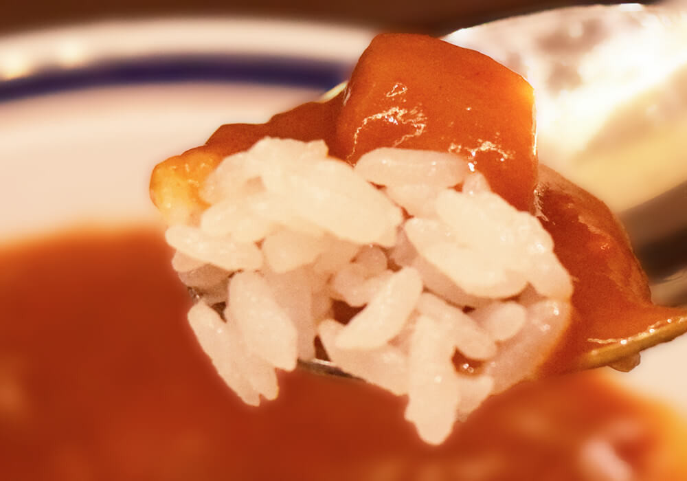 そしてカレーは、量としてはハーフサイズ程度。ややもったりとした質感で、玉ねぎやにんじんを中心に、形の残った具材も入っています。