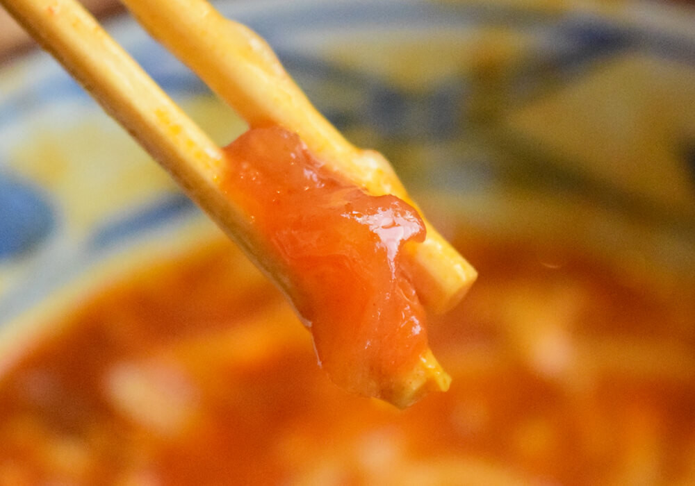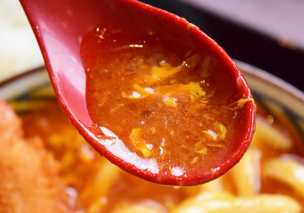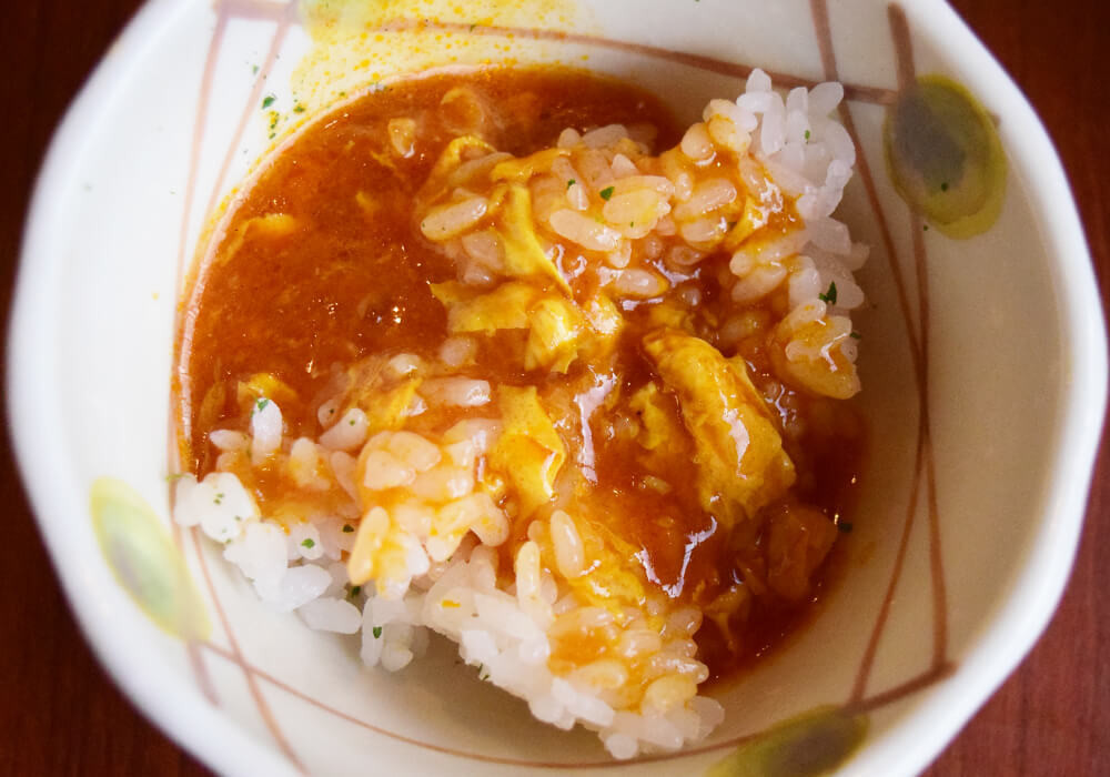 ところどころ形が崩れたトマトも入っており、ほんのりとした酸味がアクセントに。辛さの中にもバランスがあり、奥行きのある味わいに仕上がっています。