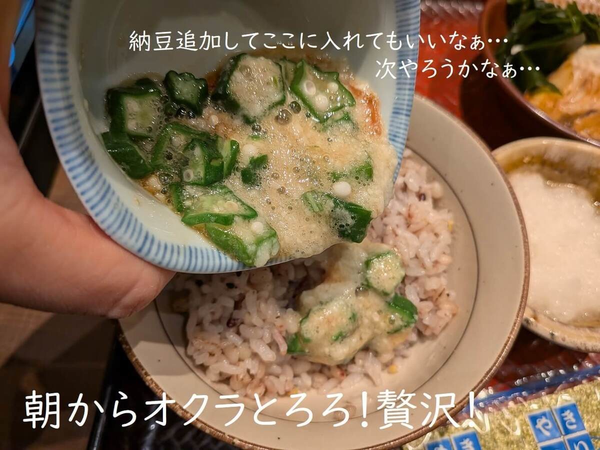 そして、以前は生卵がついていたようですが、現在は生卵から「オクラとろろ」になっていました。これも生卵にアレルギーがある筆者は歓喜!朝からとろろ、嬉しい!