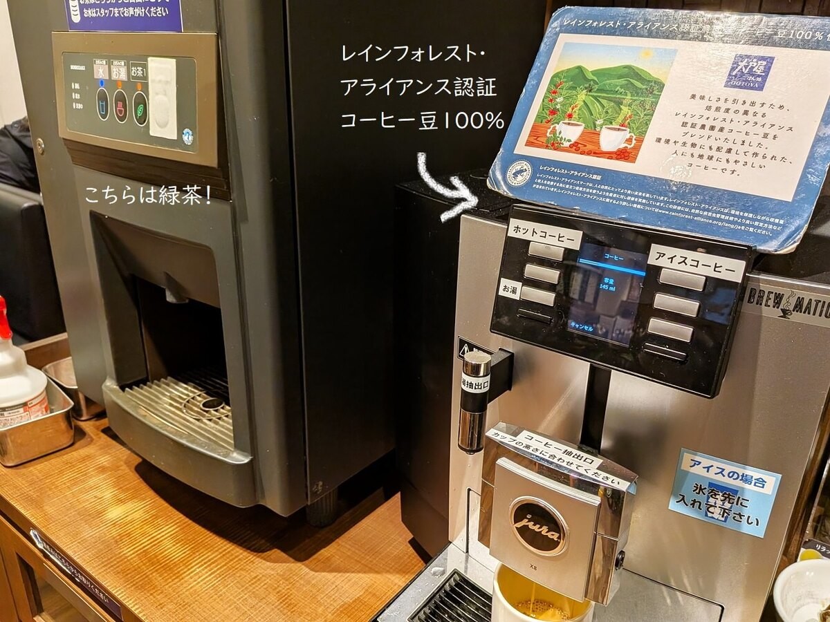 浅草橋店はこの価格でドリンクバー付きなんです。コーラーや爽健美茶や野菜ジュースはもちろん、コーヒーはなんと環境保全や人権に配慮した「レインフォレスト・アライアンス認証」を受けた農園産のコーヒーを挽きたてで楽しめます。