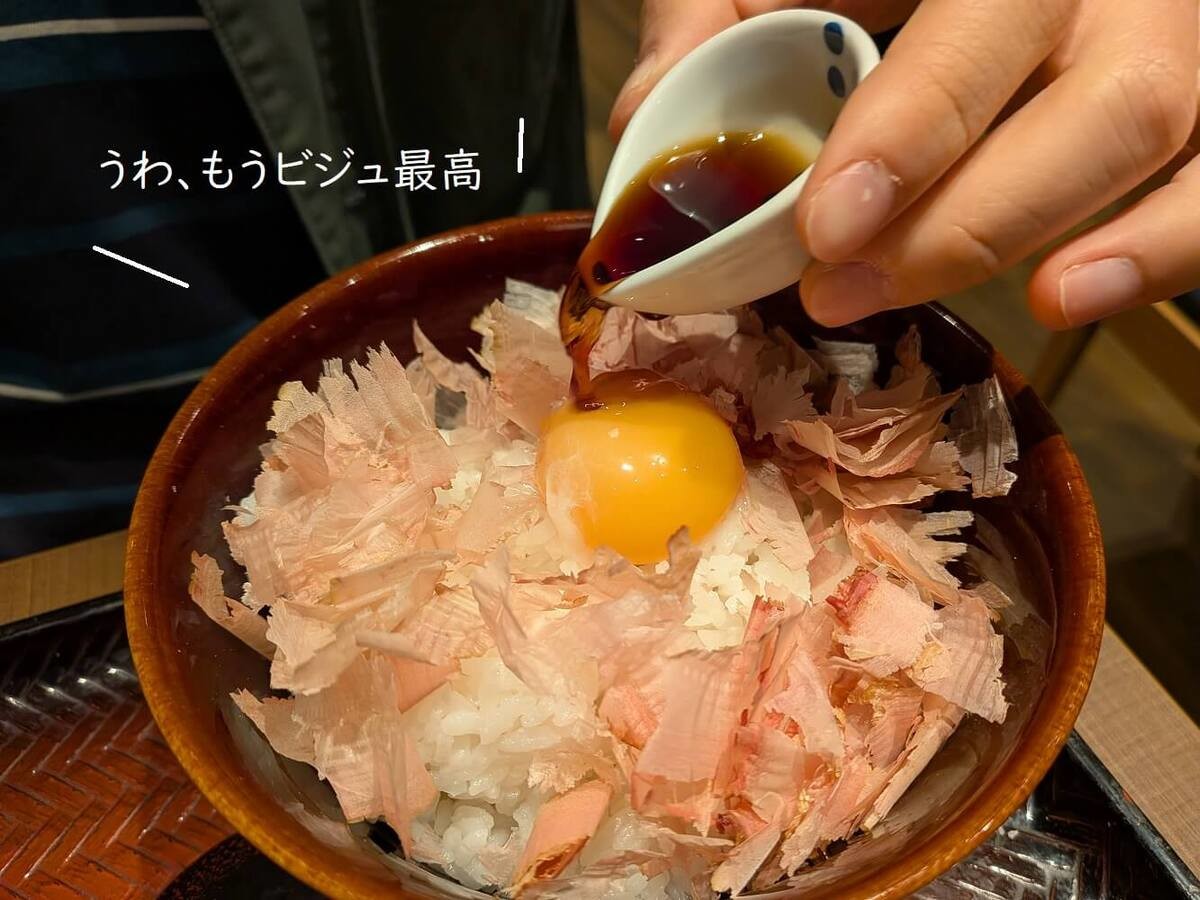 さっそくその大きな器の大盛りごはんにかつお節をたっぷり。実はこのかつお節、あの高級かつお節「本枯れ節」を毎日店舗で削りたて出してくれるんですよ、ただのかつお節ごはんじゃないんです!