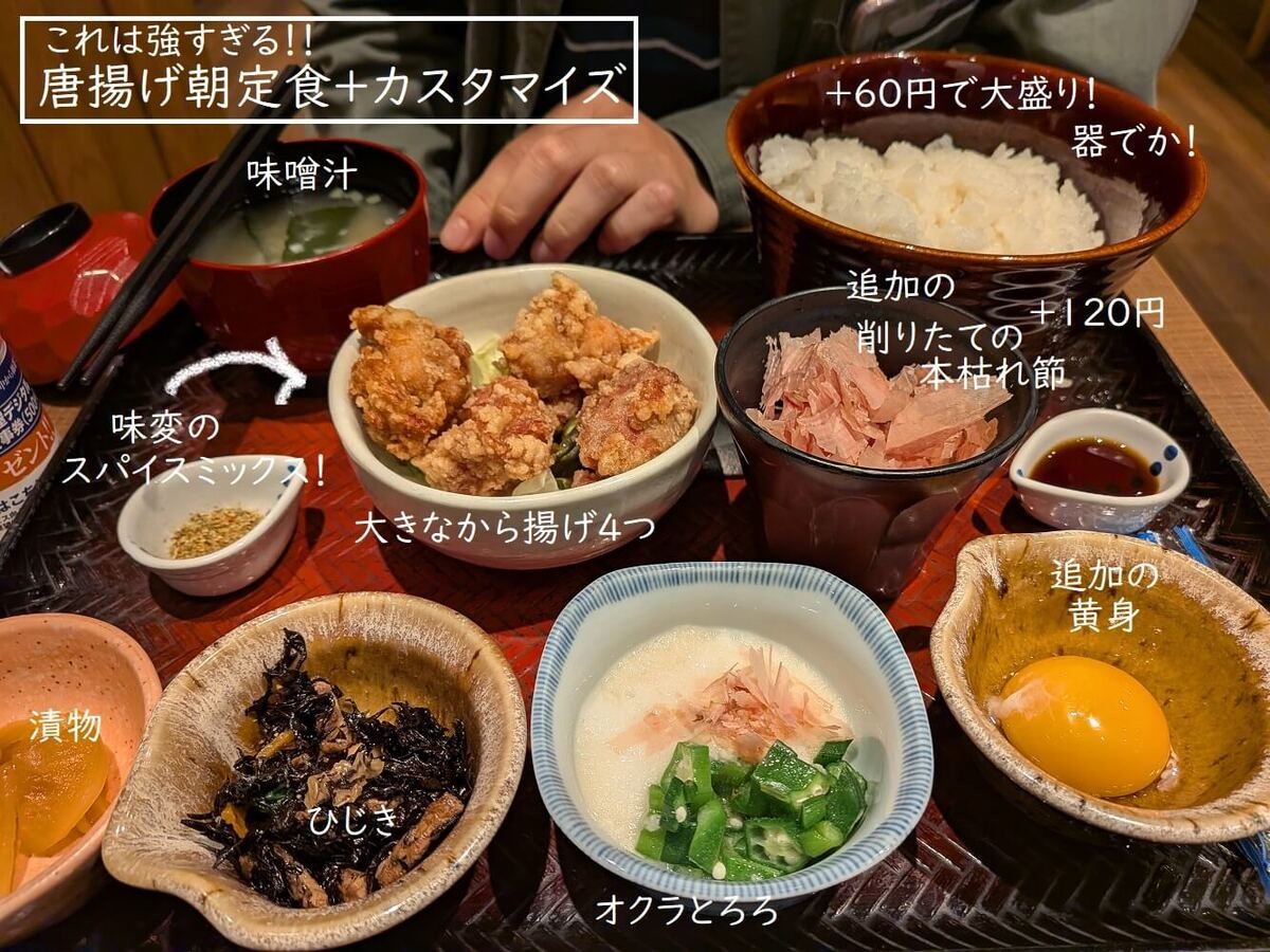 「唐揚げ朝定食」に、ご飯は大盛り300g(+60円)、大戸屋節と黄身がけセット(+120円)です。