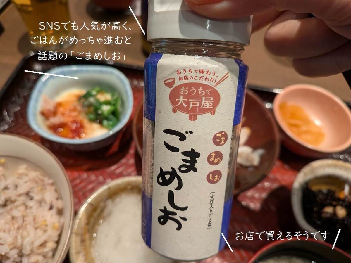 ごはんの量は、私は普通盛り(180g)で十分でしたが、別料金で増やすことができるので、その時は、こちら卓上にある、SNSでもごはんが進むと人気が高い「ごまめしお」をかけて食べても◎。