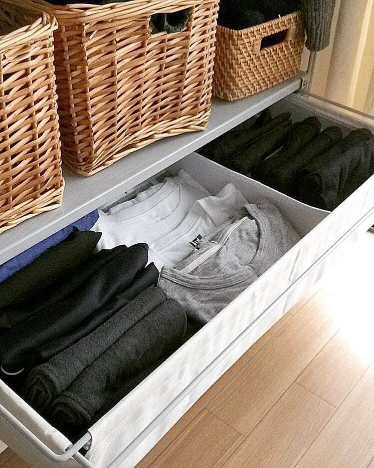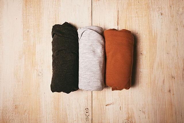 また、衣類が多く、収納場所を効率的に、また取り出しやすくしたい場合に、くるくると巻いて、並べて収納するのもおすすめですよ。