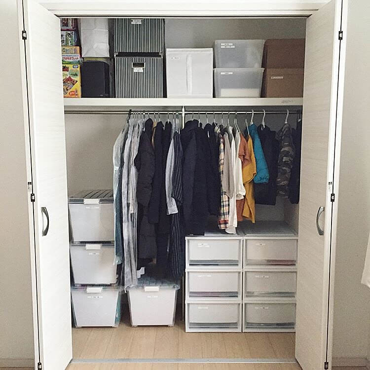 無印良品のポリプロピレン収納ボックスを並べたクローゼットの実例です。