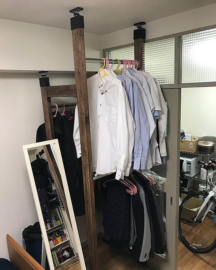 DIYで洋服を収納する場合には、壁との幅を肩幅以上開け、取り出しやすい所に柱を立てて、ポールを通します。