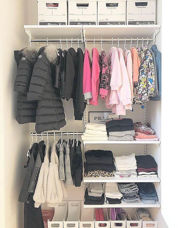 納戸をクローゼットに作り変えた実例です。子どもの衣類は小さい割にかさばることが多く、ハンガーと棚を上手に使い分けたいアイテムですね。 ハンガーをかける場所をアイテムごとに分け、コート、トップス、ボトムスが見やすく並んでいます。小物は100均で人気のセリアのプレンティボックスを上段に並べて。
