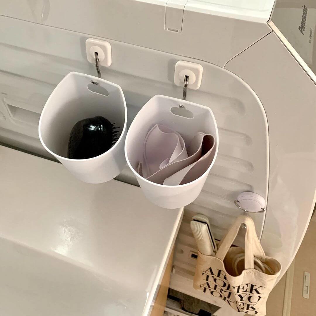 磁石がくっつく洗濯機は、マグネットとカゴを設置すれば小物入れにもなりますよ!洗面所のお隣なら、コテなどのヘアセットのアイテムを収納しておくのもおすすめです。