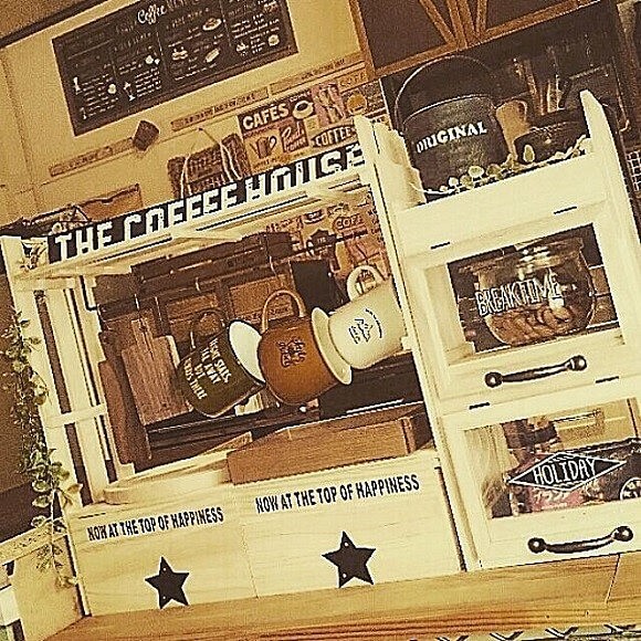 男前なカップラックにリメイクした例です。ステンシルでロゴを入れたり、シールを貼ったりすると、雰囲気が変わりますね。