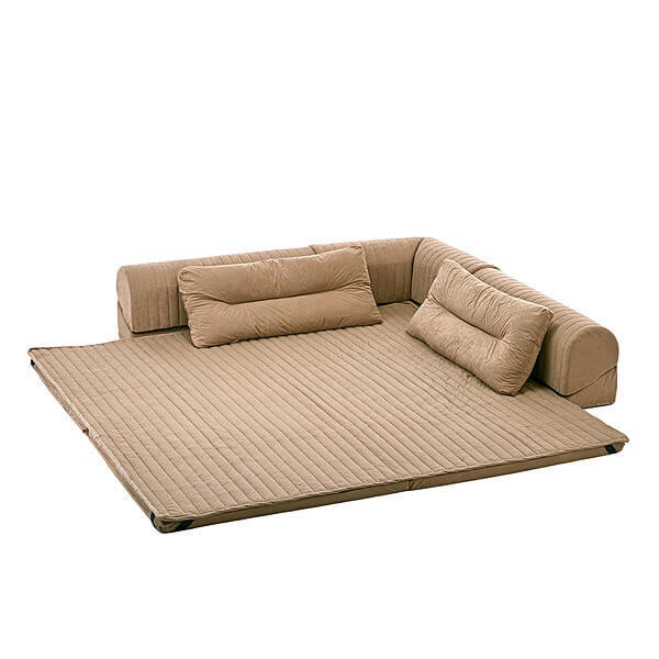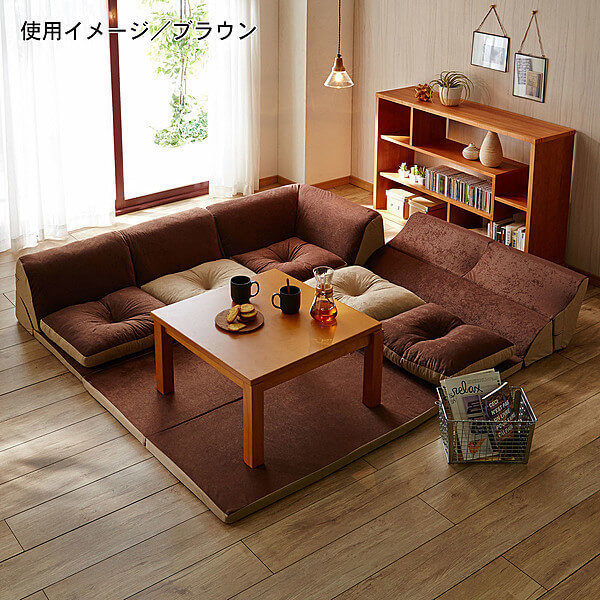 こちらの大きなフロアマットが付いたコーナークッションセットも、背もたれ部分を後ろに倒せます。中綿入り敷きパッドが付属しているので、座り心地を変えることもでき、こたつと一緒に使うことでくつろぎの空間が作れます。