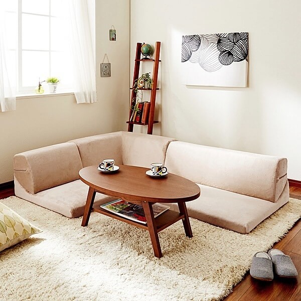 身体にぴったりとフィットするビーズ入り背もたれ付きのフロアコーナーソファです。背もたれが外気をシャットアウトしてくれるので、より暖かい空間になります。