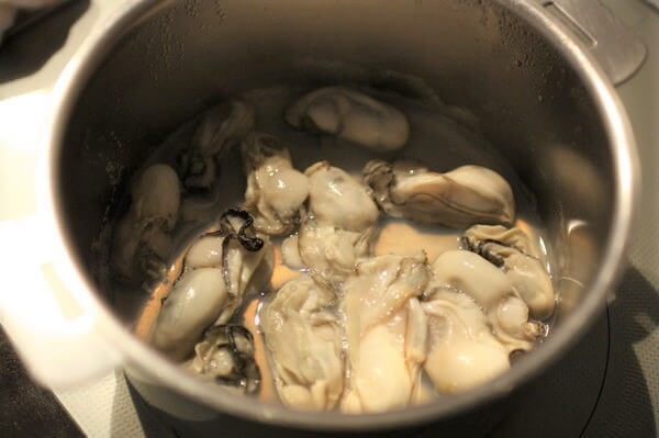 水気を切った牡蠣を鍋に入れて、白ワインか酒を大さじ2くらい入れて蓋をして火にかけます。沸騰して牡蠣がプクッとしたら火を止めてくださいね。