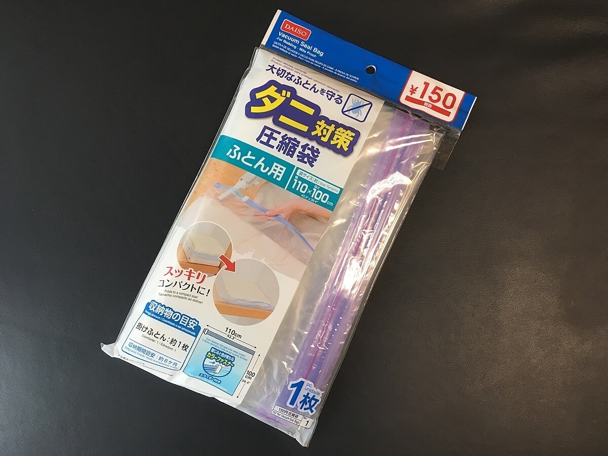 最近では、100均ショップでも布団圧縮袋が購入できます。例えばダイソーでは、ダニ対策のふとん用の圧縮袋が税込150(税抜)円です。
