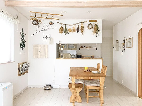 リビングは大好きなドライフラワーを飾り、みんなが落ち着いて過ごせる空間になるようにホワイト×木目(ブラウン)の色にほぼ統一しています。