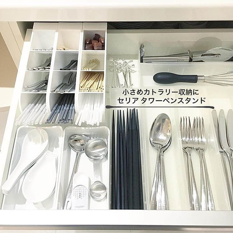 キッチンでは、調理スプーンやキッチンツールを、一目で把握できる収納に。 バラバラになりがちなコースターも立てたら、引き出しの有効スペース確保に繋がりました。